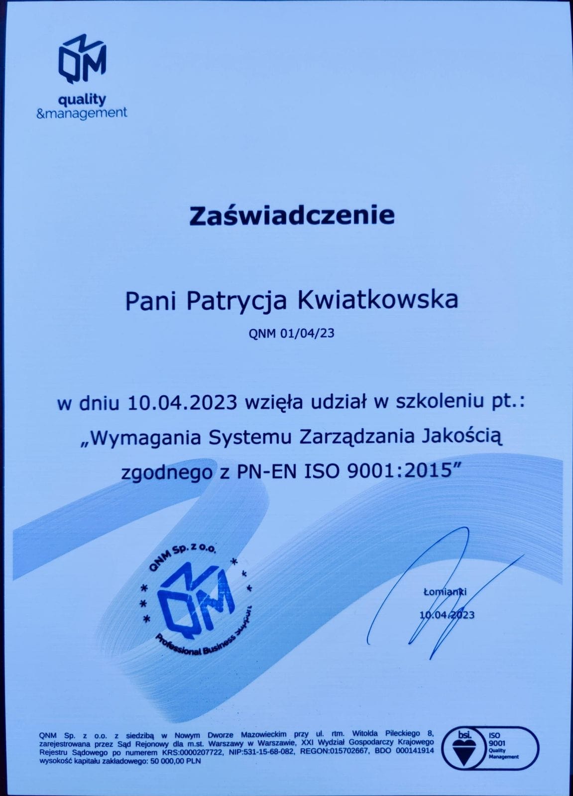 I was appointed as the Management Representative responsible for preparing the company for the ISO 9001:2015 quality management audit. To fulfill this role effectively, it was essential for me to acquire comprehensive knowledge in the field of quality management systems. Therefore, I decided to participate in a specialized training course to gain a deeper understanding of the principles and objectives behind the implementation of this standard within our organization, and to ensure thorough preparation for the upcoming external audit.